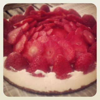 A pilótakekszet aprítógépben morzsásra törjük, 2 dkg olvasztott vajjal összegyúrjuk és a tortaforma aljában egyenletesen elnyomkodjuk. A mascarponét 6 evőkanál cukorral és a citromlével krémesre keverjük. A habtejszínt 1 evőkanál cukorral kemény habbá verjük, és óvatosan beleforgatjuk a mascarponéba. A tésztán eloszlatjuk. Én az eperrel úgy díszítettem, hogy az eper szemekből a végét egyben hagytam (mint egy kis hegycsúcsot), és a maradékot pedig vékonyan felszeltem. A sipkák kerültek a torta szélére, a szeletelt eprek pedig középre.